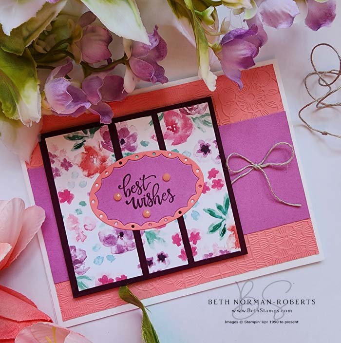 Bloom Impressions is a pretty paper that was available during Sale-a-bration. When I first started as a demonstrator I was reluctant to use my Designer Series Paper (DSP) because I was so used to creating my own backgrounds.
