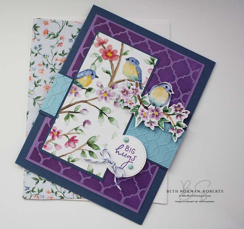 To complete my card, I used a mask to blend Highland Heather ink over top of Highland Heather cardstock. Next, I embossed my blue band with Softly Sophisticated 3D embossing folder. My sentiment comes from Perennial Postage stamp set. Taking my paper snips, I carefully cut around a bird image off of the Flight & Airy designer series paper. The coordinating envelope comes from the same DSP.