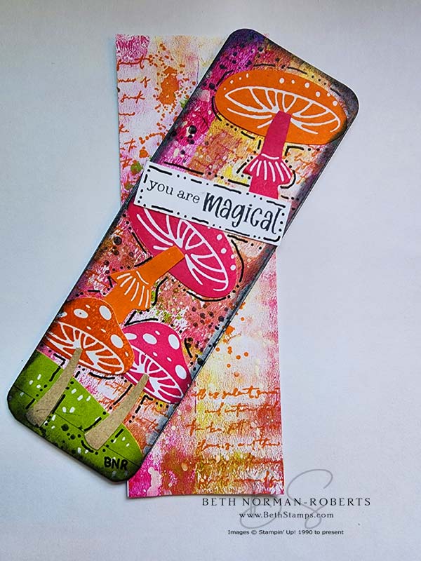 As you can see above, I made a number of bookmarks. The paint, from my gelliplate, was completely dry before I stamped onto the paper. Once I was happy with the stamping, I let the ink air dry completely before splattering white paint on the background. Choosing what stamps and dies I was going to use was easy. Above, I used Cheerful Daisies, and below I used Terrific Toadstool stamps and punch. Which is your favourite?