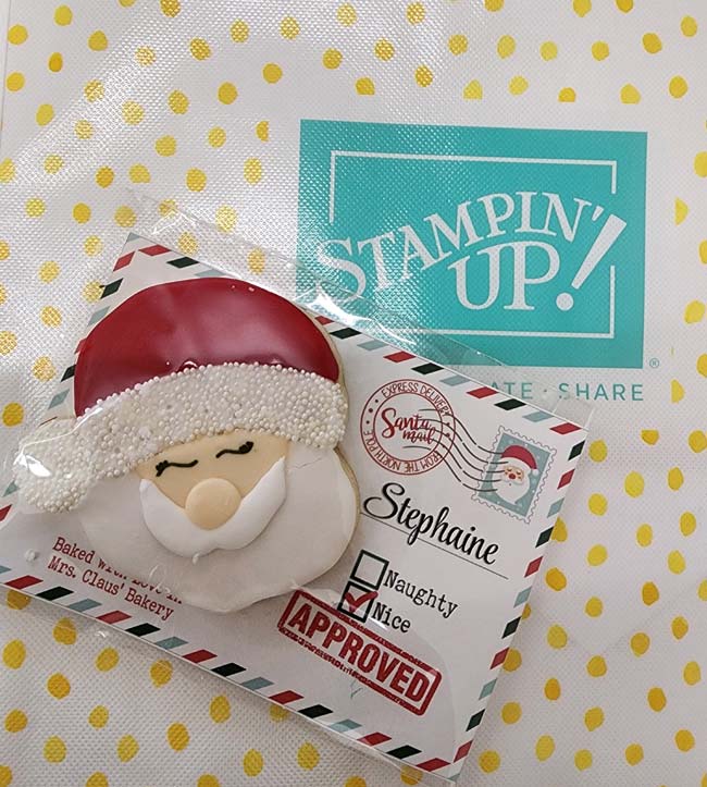 On September 20th, I had my 2nd annual Christmas in September. I like to hold my Christmas festivities in September to celebrate the release of new on-line exclusives and the Sept-Dec mini holiday catalogue. The photo above shows the seating place mark for each individual. I included one of my homemade bookmarks alongside the Stampin’ Up! reusable tote bag and cookie, but I forgot to include it in my photo (insert sad face).
