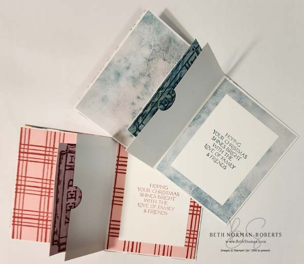 The plaid paper is retired from two Christmas’ ago, I believe. I am a big plaid lover and wanted to create a totally different look from my first card. Which one is your favourite? The photo below shows you how the inside looks.